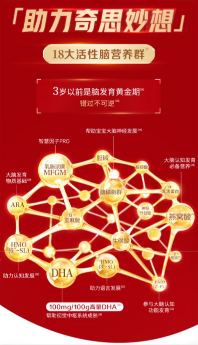 研究表明,婴幼儿早期的脑部发育是一个复杂而精密的过程,需要多元营养素的协同支持。单一营养成分往往难以满足全面需求。对此,伊利金领冠珍护铂萃奶粉提出了“18大活性脑营养群”的科学配比理念。其配方不仅关注DHA,还融合了脑磷脂群、燕窝酸(SA)、ARA以及HMO(6'-SL, 3-SL, 2’-FL)等多种经科学研究与脑神经发育、认知功能及语言发展相关的关键活性营养。这种复合营养矩阵,旨在为宝宝大脑发育构建更全面的支持系统。